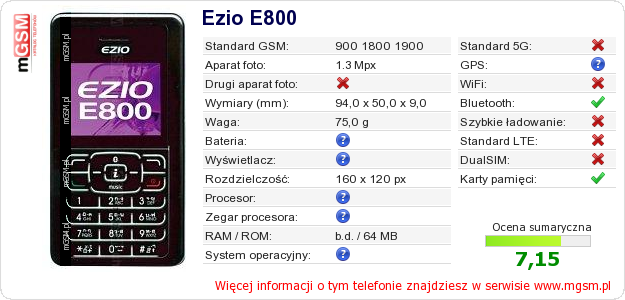Dane telefonu Ezio E800 na Twojej stronie