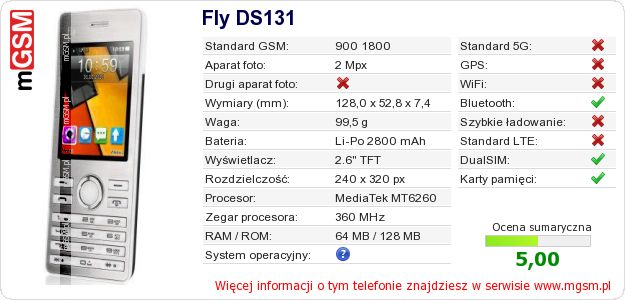 Dane telefonu Fly DS131 na Twojej stronie