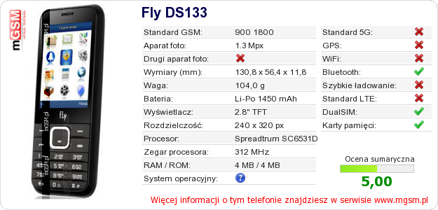 Dane telefonu Fly DS133 na Twojej stronie