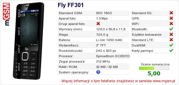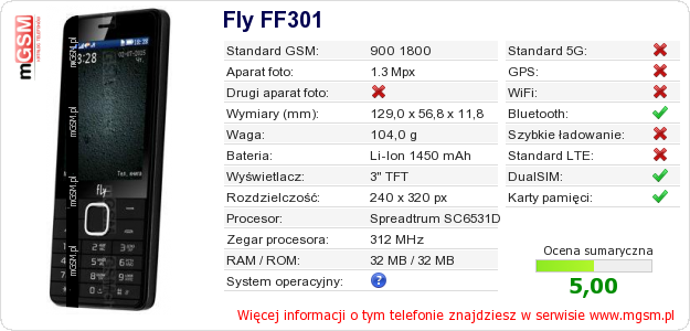 Dane telefonu Fly FF301 na Twojej stronie