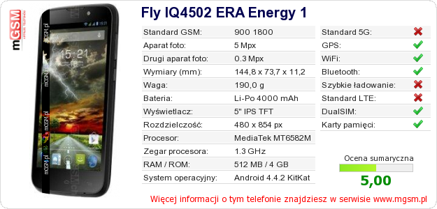 Dane telefonu Fly IQ4502 ERA Energy 1 na Twojej stronie