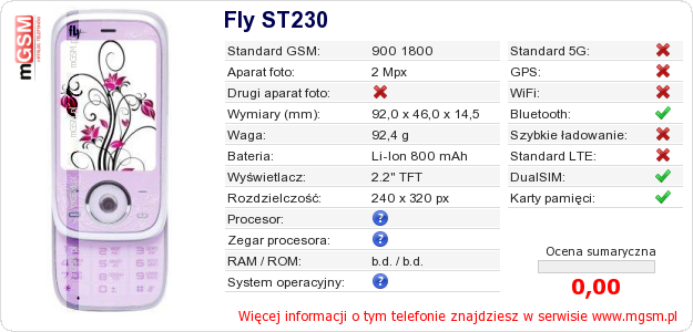 Dane telefonu Fly ST230 na Twojej stronie