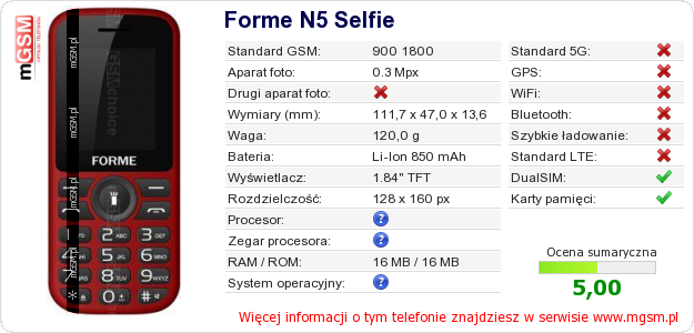 Dane telefonu Forme N5 Selfie na Twojej stronie