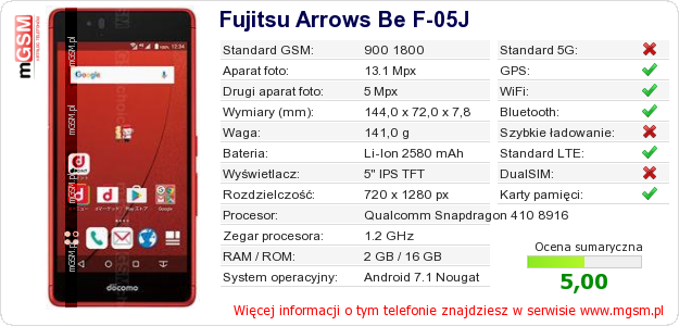 Masz swoją stronę? Chcesz wstawić gdzieś informacje o podstawowych danych telefonu Fujitsu Arrows Be F-05J ? To bardzo proste. Możesz pobrać obrazek, lub skopiować i wkleić na stronę poniższy kod:Wklejenie tego kodu spowoduje wyświetlenie poniższego obrazka: