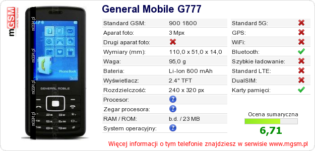 Dane telefonu General Mobile G777 na Twojej stronie