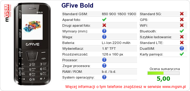 Dane telefonu GFive Bold na Twojej stronie