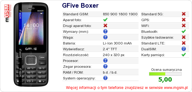 Dane telefonu GFive Boxer na Twojej stronie