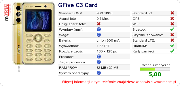 Dane telefonu GFive C3 Card na Twojej stronie