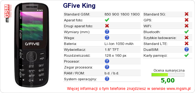 Dane telefonu GFive King na Twojej stronie