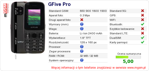 Dane telefonu GFive Pro na Twojej stronie