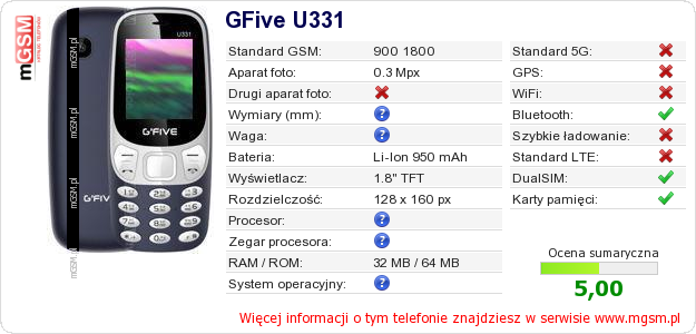 Dane telefonu GFive U331 na Twojej stronie