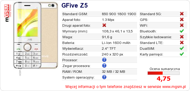 Dane telefonu GFive Z5 na Twojej stronie
