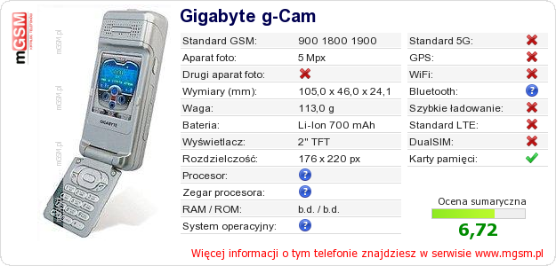 Masz swoją stronę? Chcesz wstawić gdzieś informacje o podstawowych danych telefonu Gigabyte g-Cam ? To bardzo proste. Możesz pobrać obrazek, lub skopiować i wkleić na stronę poniższy kod:Wklejenie tego kodu spowoduje wyświetlenie poniższego obrazka: