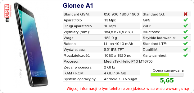Dane telefonu Gionee A1 na Twojej stronie
