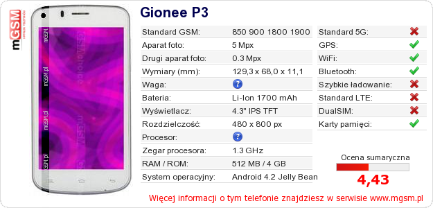 Dane telefonu Gionee P3 na Twojej stronie