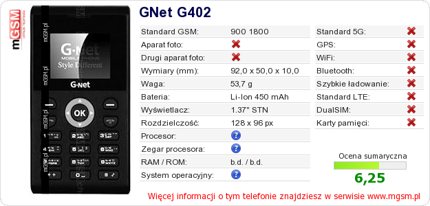 Dane telefonu GNet G402 na Twojej stronie
