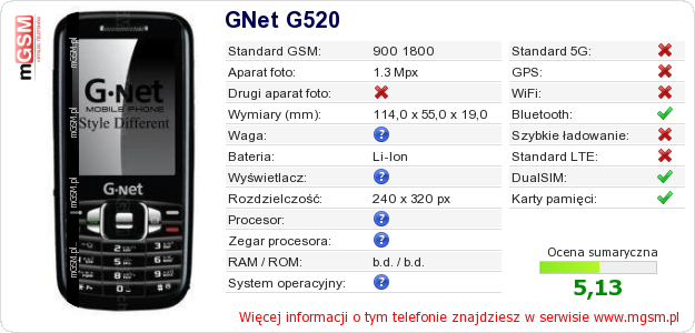 Dane telefonu GNet G520 na Twojej stronie
