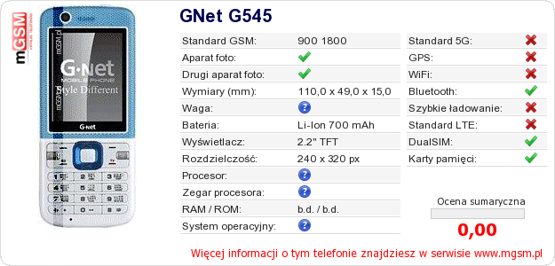 Dane telefonu GNet G545 na Twojej stronie