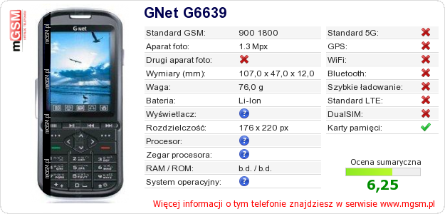 Dane telefonu GNet G6639 na Twojej stronie