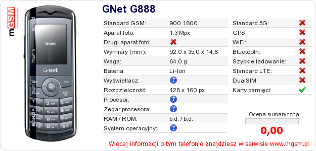 Dane telefonu GNet G888 na Twojej stronie