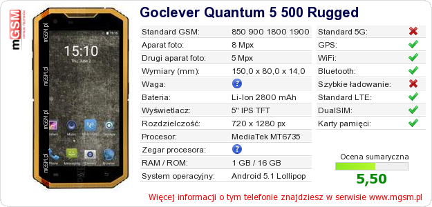 Dane telefonu Goclever Quantum 5 500 Rugged na Twojej stronie