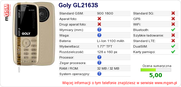 Dane telefonu Goly GL2163S na Twojej stronie