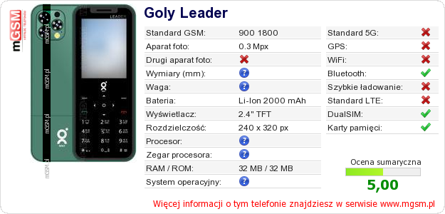 Masz swoją stronę? Chcesz wstawić gdzieś informacje o podstawowych danych telefonu Goly Leader ? To bardzo proste. Możesz pobrać obrazek, lub skopiować i wkleić na stronę poniższy kod:Wklejenie tego kodu spowoduje wyświetlenie poniższego obrazka: