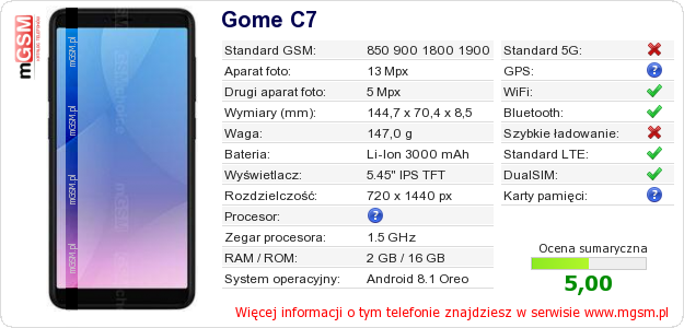 Dane telefonu Gome C7 na Twojej stronie