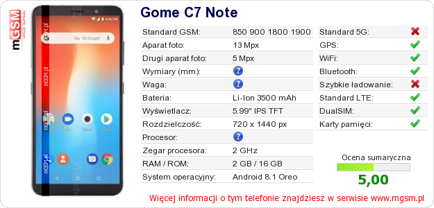 Dane telefonu Gome C7 Note na Twojej stronie