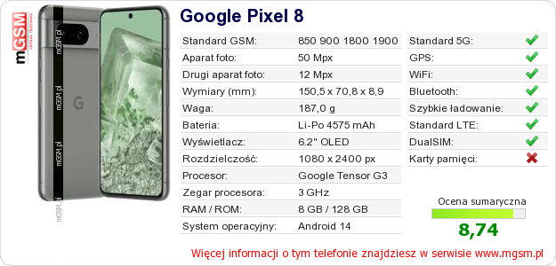 Dane telefonu Google Pixel 8 na Twojej stronie