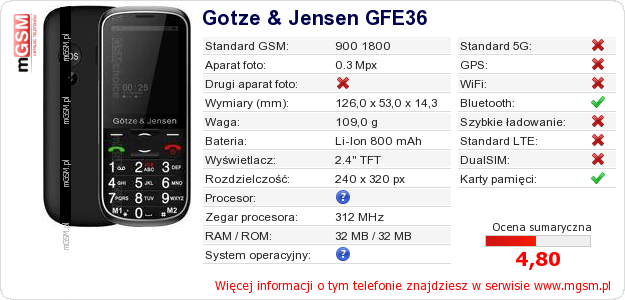 Dane telefonu Gotze & Jensen GFE36 na Twojej stronie