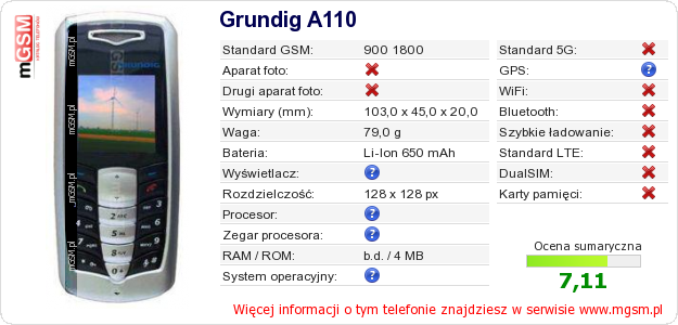 Dane telefonu Grundig A110 na Twojej stronie