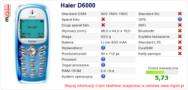 Dane telefonu Haier D6000 na Twojej stronie