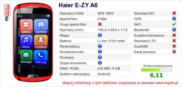 Dane telefonu Haier E-ZY A6 na Twojej stronie