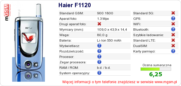 Dane telefonu Haier F1120 na Twojej stronie
