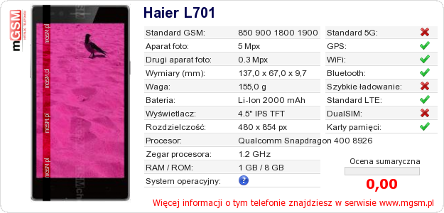 Dane telefonu Haier L701 na Twojej stronie