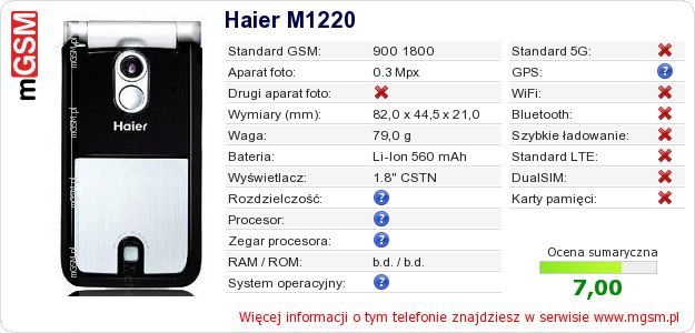 Dane telefonu Haier M1220 na Twojej stronie