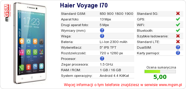 Dane telefonu Haier Voyage I70 na Twojej stronie
