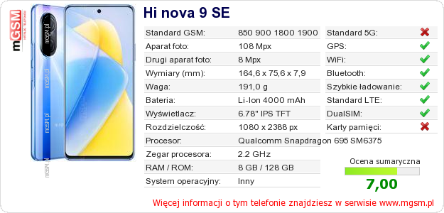 Dane telefonu Hi nova 9 SE na Twojej stronie