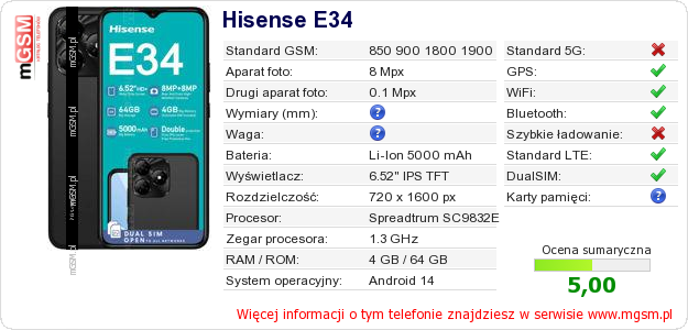 Dane telefonu Hisense E34 na Twojej stronie