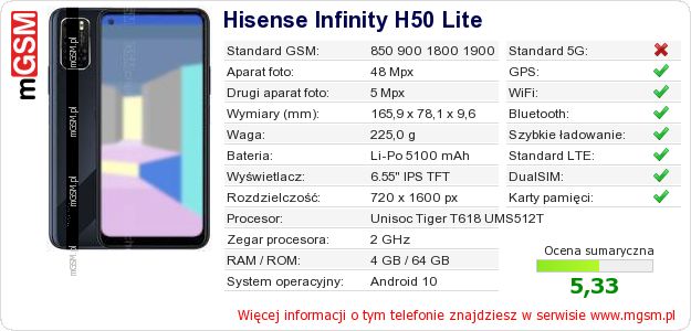 Dane telefonu Hisense Infinity H50 Lite na Twojej stronie