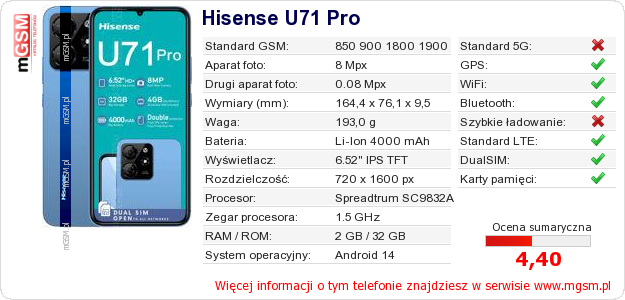Dane telefonu Hisense U71 Pro na Twojej stronie