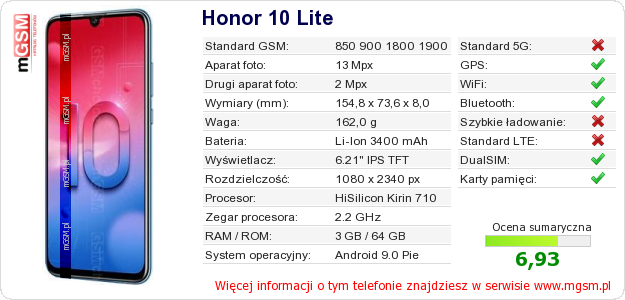 Dane telefonu Honor 10 Lite na Twojej stronie