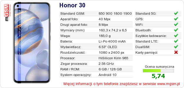 Dane telefonu Honor 30 na Twojej stronie