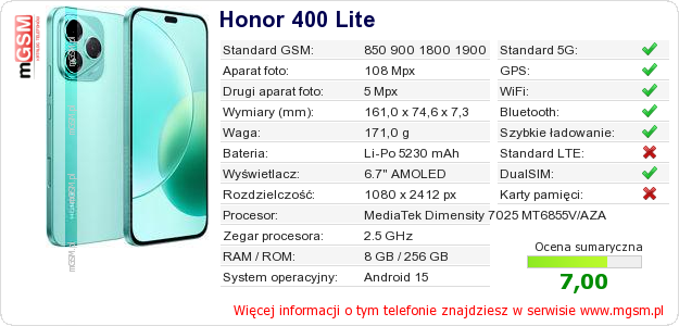 Dane telefonu Honor 400 Lite na Twojej stronie