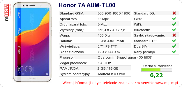 Dane telefonu Honor 7A AUM-TL00 na Twojej stronie