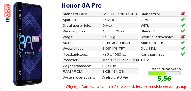 Dane telefonu Honor 8A Pro na Twojej stronie
