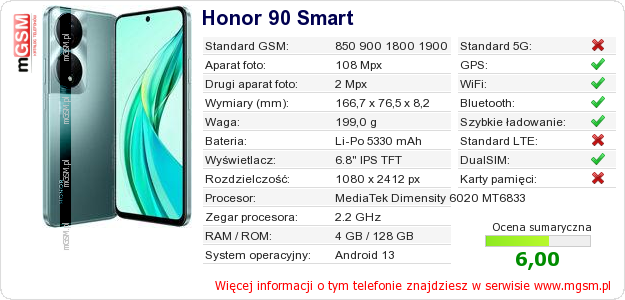 Dane telefonu Honor 90 Smart na Twojej stronie