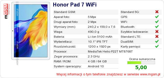 Dane telefonu Honor Pad 7 WiFi na Twojej stronie
