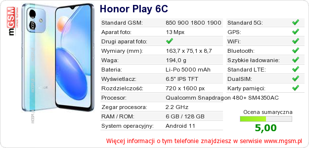 Dane telefonu Honor Play 6C na Twojej stronie